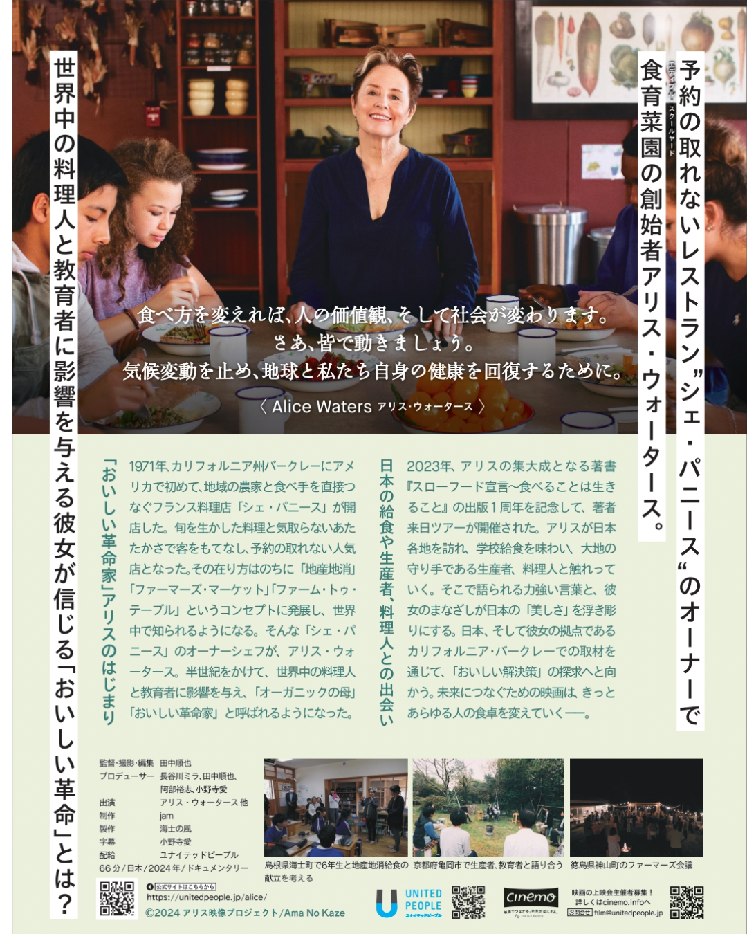 アリスウォータースのドキュメンタリー映画「食べることは生きること」66 分/日本/2024年/ドキュメンタリー https://unitedpeople.jp/alice/