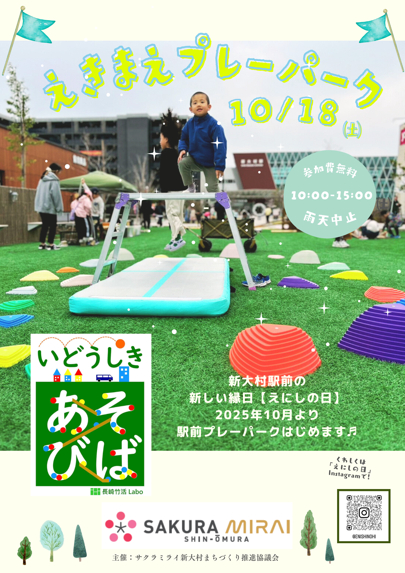 新大村駅前で出張プレーパークスタートします🌳大村市内の森林ボランティア団体である竹活Laboさんによるいどう式あそびば✨が新大村駅前に🤞だれでも無料で利用できるので買い物ついでにお立ち寄りください☺️ ※雨天時は中止です、ご了承下さい🤲🌳駅前プレーパーク🌳10/18【土】10時-15時参加費無料主催:サクラミライ新大村まちづくり推進協議会事務局:コミュニティ拠点キイト舎